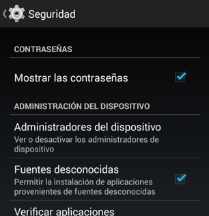 Para poder instalarla debemos de tener la opcion de instalar aplicaciones de origen desconocido en Android. Para esto entramos a Configuración -> Seguridad y ahí marcar la casilla (Fuentes desconocidas) como aparece en la siguiente imagen.