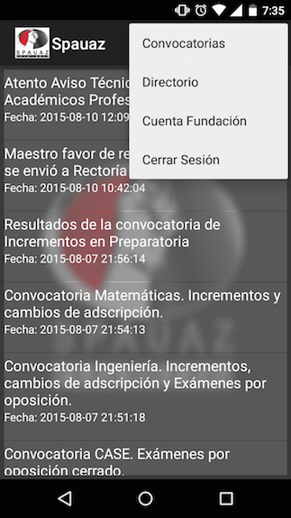 La primer pantalla que muestra la aplicación es el listado de noticias de la página principal del SPAUAZ. A demás de recibir las notificaciones cuando existen nuevas noticias o convocatorias.