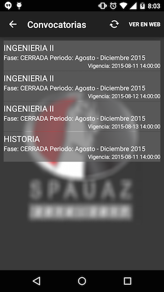 En esta pantalla vemos el listado de convocatorias activas. Se puede dar clic en el botó "Ver en Web" para abrir el navegador.