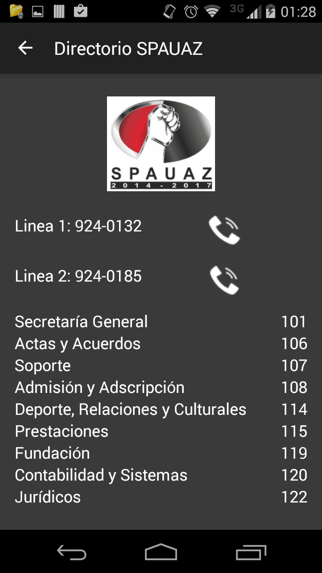 Al dar clic en el menú “Directorio” se muestra la información del directorio telefónico del SPAUAZ y en los botones de llamar podemos dar clic para realizar la llamada a cualquiera de las líneas.